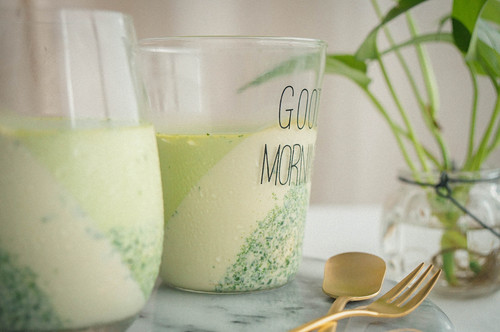 步骤5、冻好后取出杯子,把剩余的香菜泥、香菜汁、50g牛奶一起加入剩余的香菜奶液中,混合均匀后倒入布丁杯中,接着冷藏即可!