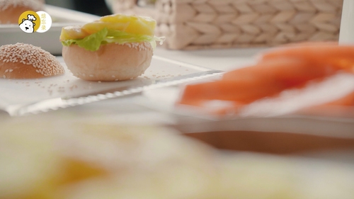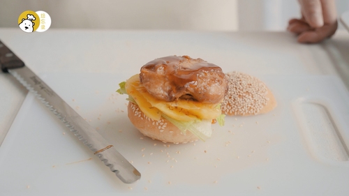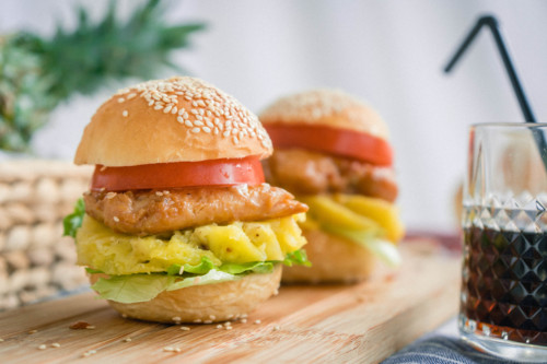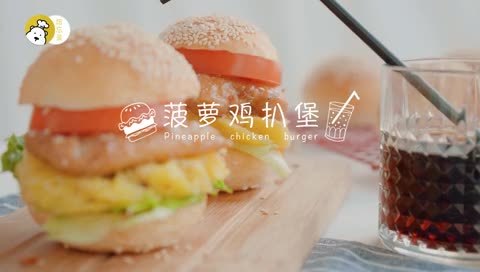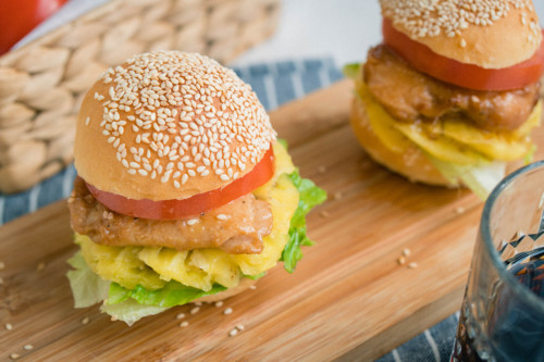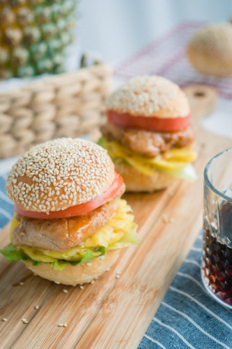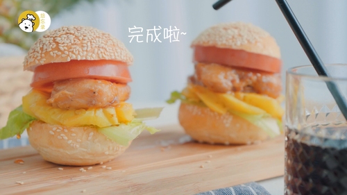步骤11、面包切半,放上生菜、菠萝、鸡排、照烧汁、番茄,大功告成啦~