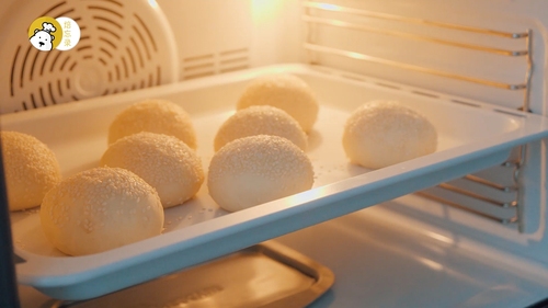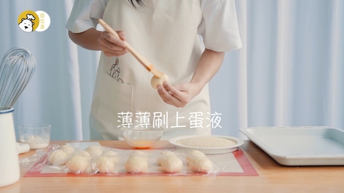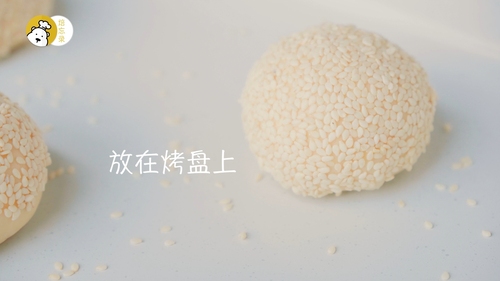 步骤5、一个个取出圆面团,表面刷薄薄一层蛋液,再粘一层芝麻,错落的摆放烤盘上;