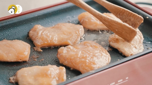 步骤10、鸡排双面煎至金黄,倒入照烧汁小火煮至收汁;