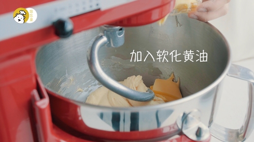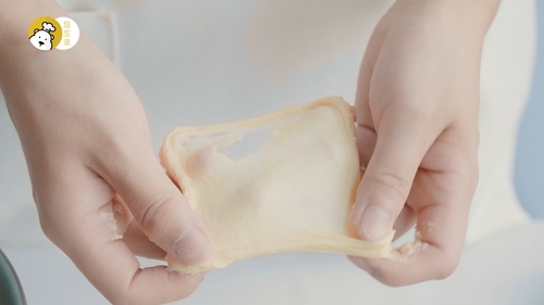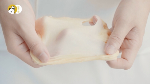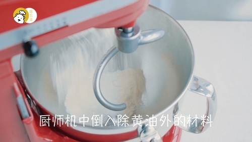 步骤1、面团除黄油外材料混合,揉到光滑出厚膜的状态,加入黄油继续揉到扩展状态;