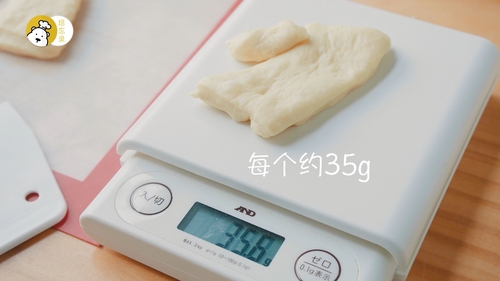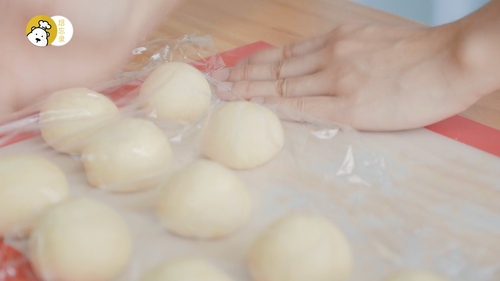 步骤4、发好的面团取出排气,分割成35g左右一个,滚圆后用保鲜膜密封好备用;