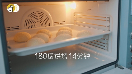步骤7、发酵完成后,取出烤盘,并180℃预热烤箱;预热完成后放入中层,烘烤14分钟,取出晾凉;