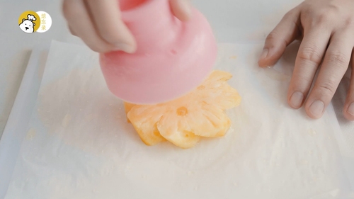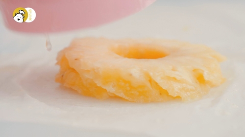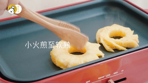 步骤9、番茄切片,生菜撕成小片;菠萝切片,用模具扣成圆环, 烧热平底锅,菠萝煎软取出;