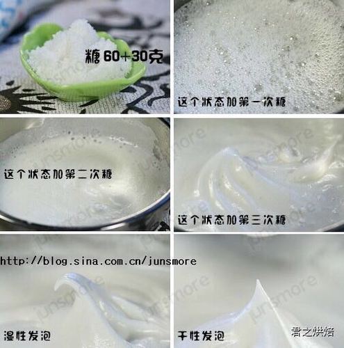 步骤2、用打蛋器把蛋白打到呈鱼眼泡状的时候,加入1/3的细砂糖(20克),继续搅打到蛋白开始变浓稠,呈较粗泡沫时,再加入1/3糖。再继续搅打,到蛋白比较浓稠,表面出现纹路的时候,加入剩下的1/3糖。(如果一次加入糖过多,会妨碍蛋白的起泡,所以打蛋白的时候,一般习惯使用分次加糖的方式。当然,这并不代表你一次把糖全加进去,蛋白就打不发了,只不过会更花功夫哈。)