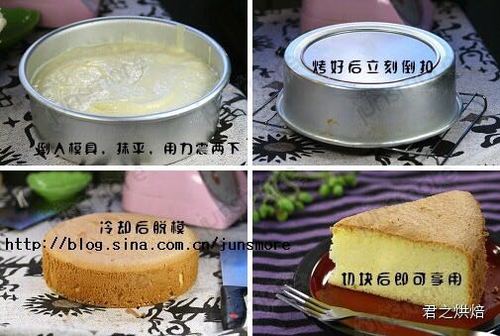 步骤6、将混合好的蛋糕糊倒入模具,抹平,用手端住模具在桌上用力震两下,把内部的大气泡震出来。放进预热好的烤箱,170度,约1个小时即可。烤好后的蛋糕从烤箱里取出来,立即倒扣在冷却架上直到冷却。然后,脱模,切块即可享用(直接吃已经非常好吃了)。也可以用来制作各种裱花蛋糕。