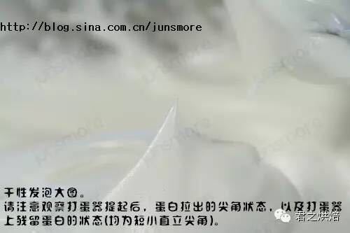 步骤3、再继续打一会儿,当提起打蛋器,蛋白能拉出弯曲的尖角的时候,表示已经到了湿性发泡的程度。如果是做戚风蛋糕卷,蛋白打发到这个程度就可以了。但如果制作常规的戚风蛋糕,就还需要继续搅打。 当提起打蛋器的时候,蛋白能拉出一个短小直立的尖角,就表明达到了干性发泡的状态,可以停止搅打了。