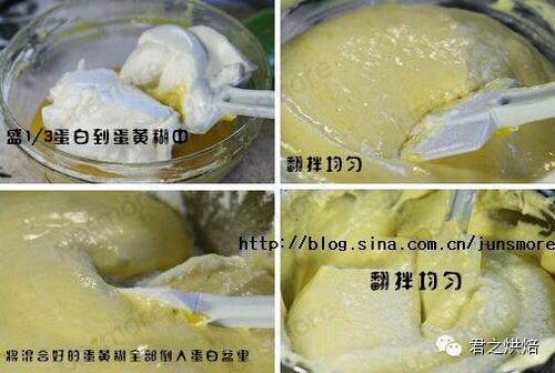 步骤5、盛1/3蛋白到蛋黄糊中。用橡皮刮刀轻轻翻拌均匀(从底部往上翻拌,不要划圈搅拌,以免蛋白消泡)。翻拌均匀后,把蛋黄糊全部倒入盛蛋白的盆中,用同样的手法翻拌均匀,直到蛋白和蛋黄糊充分混合。混合好后的状态应该是比较浓稠均匀的浅黄色。如果你做到这一步,蛋糕糊能达到图中状态的话,那么恭喜你,你已经成功了90%。