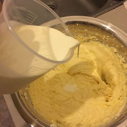 步骤3、加入动物性鲜奶油100g,用打蛋器搅拌均匀。鲜奶油需要多次少量加入,边加入边搅拌,确保充分与奶油芝士糊混合。