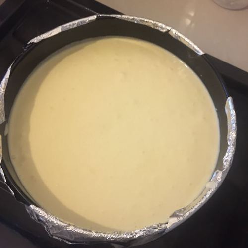 步骤6、将翻拌均匀的芝士蛋糕糊倒入蛋糕模具中。蛋糕模具内壁可以涂上薄薄一层黄油防粘。若蛋糕模具为活底模,需在模具周围包一到两层锡纸防止底部进水。在烤盘中加入热水,将蛋糕模具放入水里(水的高度最好能超过蛋糕糊的一半)。