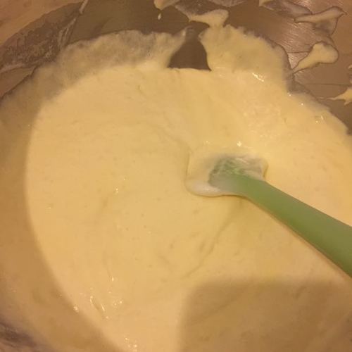 步骤5、将打发的蛋清倒入奶油芝士糊中,用刮刀从底部往上快速翻拌,使之混合均匀。注意不要画圈搅拌以免蛋清消泡。