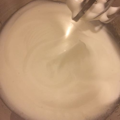 步骤4、在蛋清中分三次加入细砂糖20g,打发成可以拉出弯弯尖角的湿性发泡状态(打蛋器搅拌棒要洗干净并擦干后再使用)。还可根据口味加入香草精2滴,柠檬汁2勺。