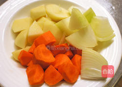 步骤2、洋葱切大块,马铃薯、红萝卜切滚刀块。