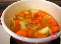 步骤6、加入水(高汤也可),中火煮5分钟,让洋葱、红萝卜释放甜味。