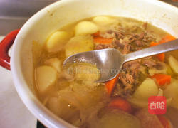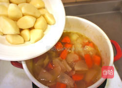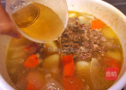 步骤7、红萝卜煮软再加马铃薯及牛肉。小火炖煮5分钟。