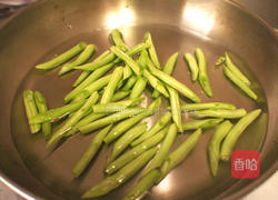 步骤10、四季豆洗净切斜角,烫30秒后加几滴油捞起泡冰水,可避免变色。