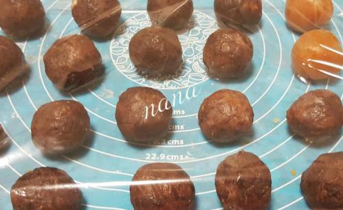 步骤3、面皮松弛过程中准备馅料,豆沙馅分成约25克一份,包入蛋黄备用。