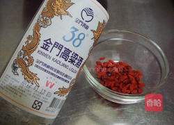 步骤3、枸杞1大匙略沖洗后用调味中ˊ金门高粱酒1大匙浸泡备用