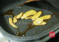 步骤4、锅子加入麻油2大匙中小火加热ˊ慢慢煸香老姜片ˊ至姜片整个焦香