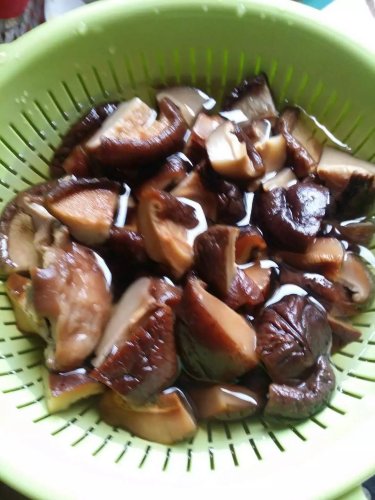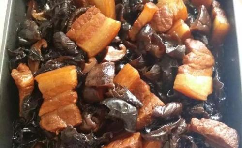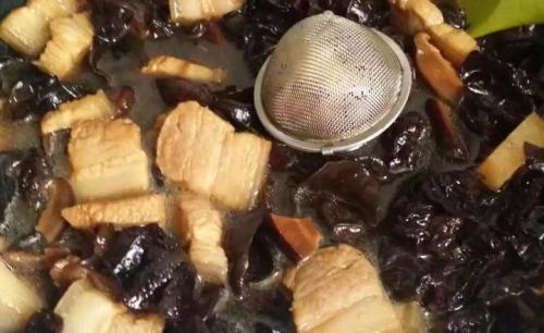 步骤6、加入香菇、木耳、翻炒一下 ,加老抽 、生抽、古越龙山、冰糖,放入卤料包,加水淹没食材,大火煮开后小火慢炖,