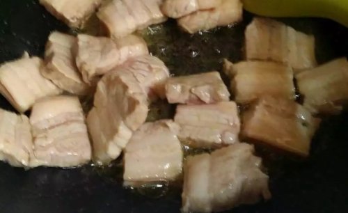 步骤5、然后倒入五花肉煸炒至金黄色,