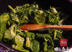 步骤4、趁镬烧得红红,放入豆苗兜炒,不消半分钟便可将豆苗炒至软身及带有少许水份,盛起趁热供食。