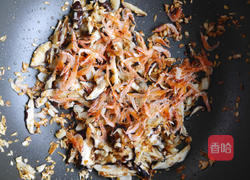 步骤3、香油爆香红葱头,依序放入香菇、樱花虾、干贝丝炒香