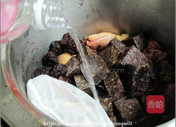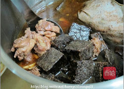 步骤3、鸭肉炒至肉都变色后,整锅移到压力锅,另外再加米血糕和中药包,倒入1瓶米酒和3倍量的水。