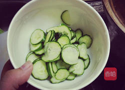 步骤3、等待的时间将小黄瓜切成薄片,加入盐巴抓一抓。静待约3分钟,用冷水沖洗。