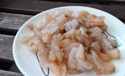 步骤1、鲜虾洗净去头去尾,剥出虾仁。虾仁背部开一刀,取出虾线。开背开深一点虾球卷的更漂亮,但是注意不要切断了。