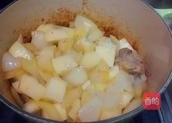 步骤4、待洋葱炒出香味之后,倒入马铃薯继续拌炒~~接着放入肉块拌炒均匀