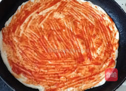 步骤7、平底锅放入少许油,将做好的饼皮放入,刷一层番茄酱。