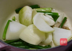 步骤5、取一锅,加入一大匙油后煸香姜片后加入葱白拌炒至香味出来