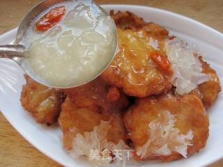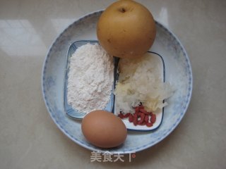 步骤2、把梨洗干净去皮,切成细丝;银耳用水泡软,撕成小朵;枸杞洗净备用。