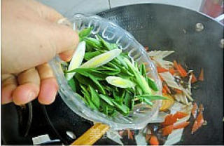 步骤7、最后再把蒜苗放入,加一点盐,鸡精,香油炒匀即好。