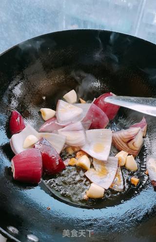 步骤3、热锅,倒油,加入洋葱,大蒜炒出香味。