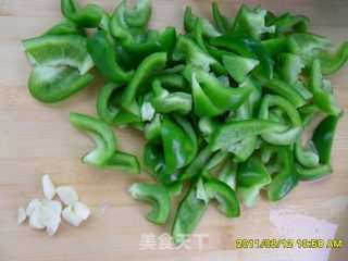 步骤5、青椒洗干净,切成滚刀块。蒜也切末待用。