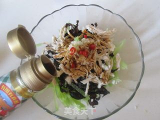 步骤7、将莴苣丝、黑木耳丝和鸡丝放入碗中, 加入少许盐拌匀;