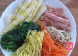 步骤6、胡萝卜丝、金针菇、菠菜分别焯熟后用盐、味精调味。与切好的鸡蛋丝、火腿丝装盘备用。