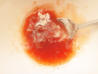 步骤9、可以摆杯了!依次在杯中放入草莓果酱垫底、放入杯体2/3奶冰、再次放入草莓果酱,最后放入荔枝虾球即可,趁冰凉食用。